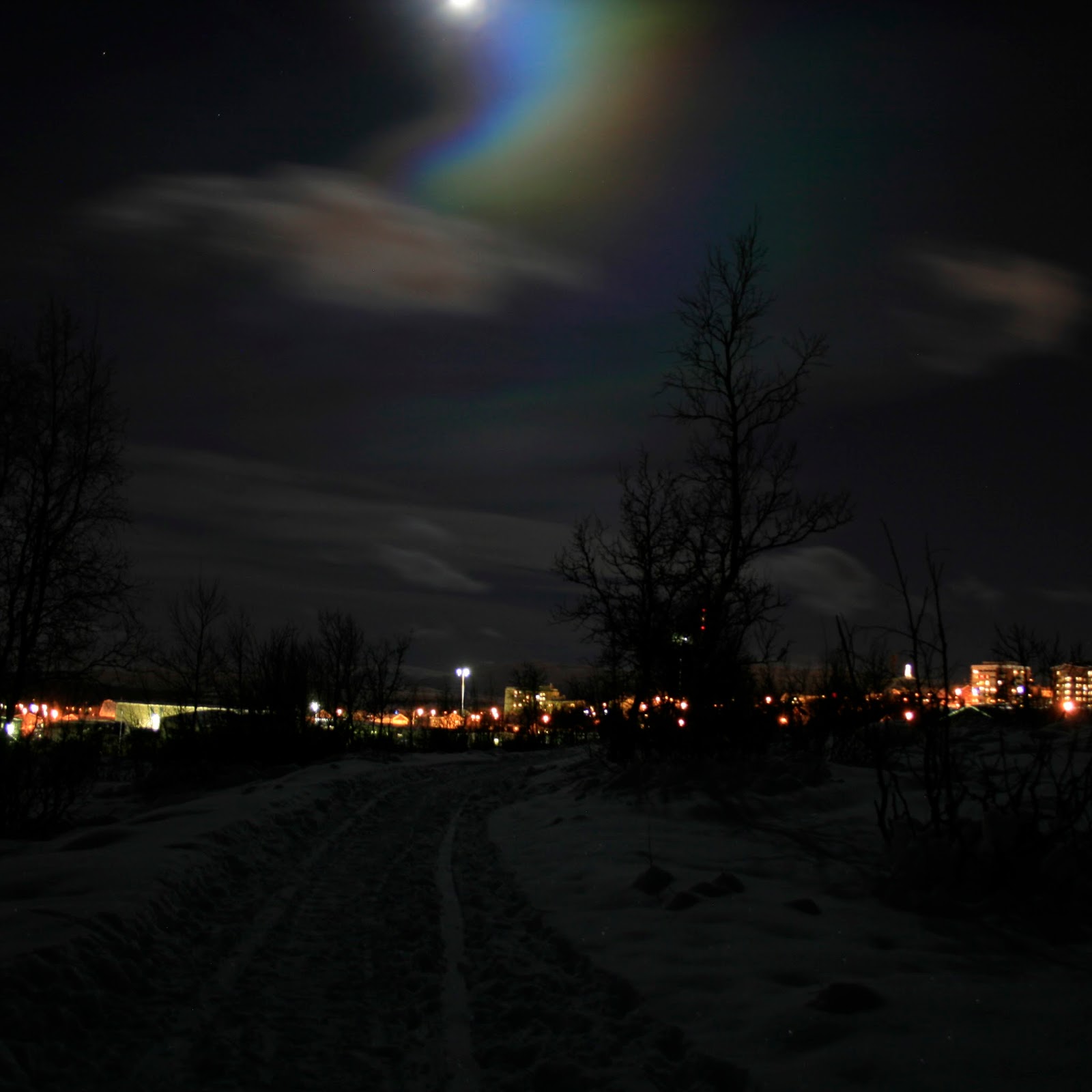 This photo was taken one night in my beloved Lapland, when my greatest wish was to capture pictures of the northern lights. I thought I saw something green flicker in the sky from the window of my grandparents' house. I ran downstairs, threw warm clothes on my body (literally), and grabbed the kick sled, and rushed towards my childhood hill, where there are less streetlights. There I stood in the middle of the night, under the vast and starlit sky for an hour, feeling really small. It's incredible how small one can feel. And the silence. I have always enjoyed silence, but this was on another level. It was like "I could hear the sounds of the universe silence", and there was only me. I have never felt that lonely in my life, but somehow I quite enjoyed it. During this hour, I snapped some photo's to practice for the eventual green snake to appear in the sky. Then I noticed, whilst I was so busy looking for green signs in the sky, I had missed the awe(!!)some phenomenon occurring right in front of my nose: some kind of lunar rainbow halo! After this shot I decided to sled back home. My fingers and toes were freezing cold from standing still, and this feeling of disappointment spread in my body. I had waited the whole week for northern lights, why wouldn't they show up tonight? The report I had read earlier said that the chance was extra high today. When I passed the outdoors ice rink where I learned to ice skate as a child, I saw something in the corner of my eye. Could it be...?